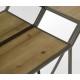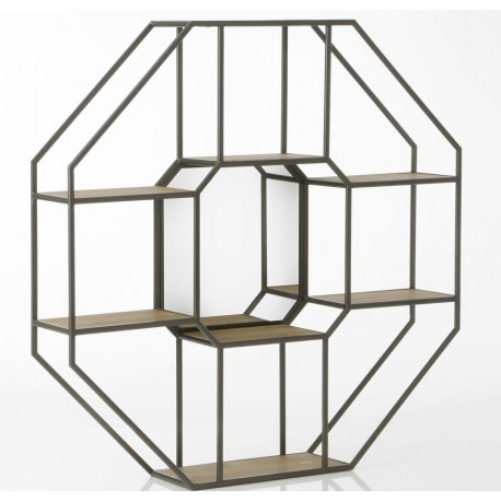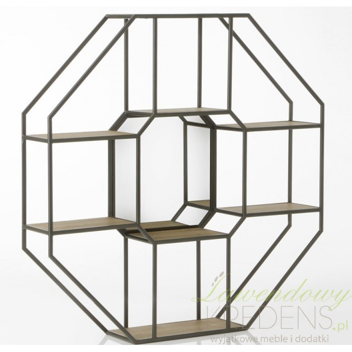 Półki ścienne w kształcie wielokąta są wykonane z drewna jodłowego i mają metalowy stelaż. Drewno o ciepłym wybarwieniu w połączeniu z surowym metalem daje w kompozycji ze sobą piękny mebel. Pośród drewnianych półek znajduje się jedno duże lusterko i kilka mniejszych wokół niego. Meble loft to doskonały sposob by na nowo zakochać się w swoim wnętrzu.