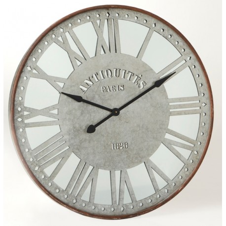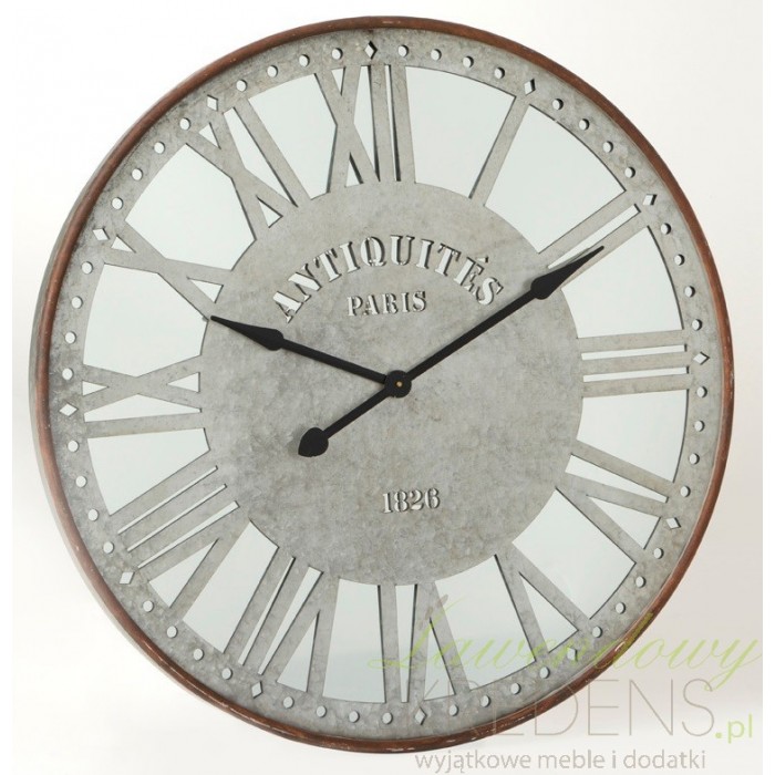Duży zegar ścienny to jedna z propozycji do aranżacji wnętrza w stylu industrialnym. Zegar jest wykonany z metalu w kolorze szarości i utrzymany w postarzanym klimacie. Na jego zewnętrznej krawędzi wykonano ciemną obwódkę, a wewnątrz umieszczono napisy wykonane metodą wycięć w metalowej tarczy. Zegary ścienne to niezastapione detale we wnętru, wskazują godzinę i aranżują ścianę.