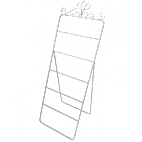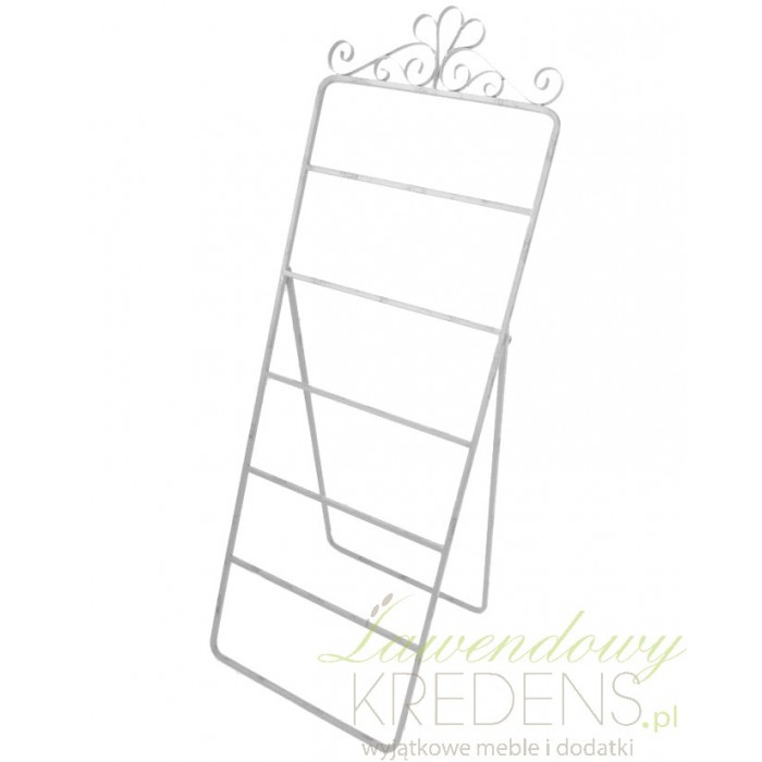 Biały stojak na ręczniki z dekoracyjną ozdobą na górnej ramie to model o bardzo prostej konstrukcji. Dobierz do niego inne dodatki łazienkowe w białym kolorze!