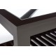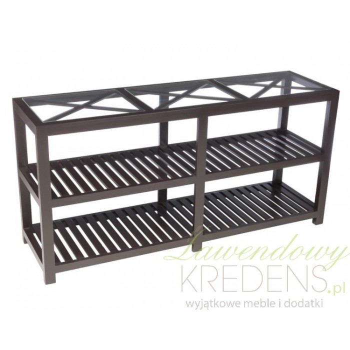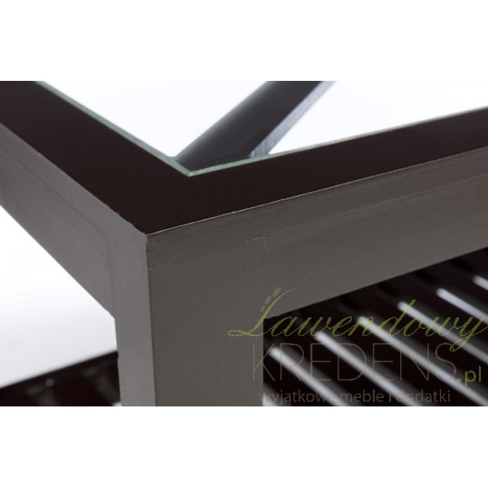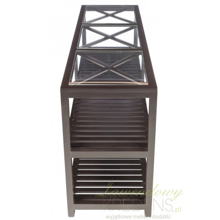 Czarna konsola prowansalska to mebel wykonany z drewna, który swoją urodę zawdzięcza blatowi, na który nałożone są trzy kwadratowe tafle szkła.