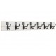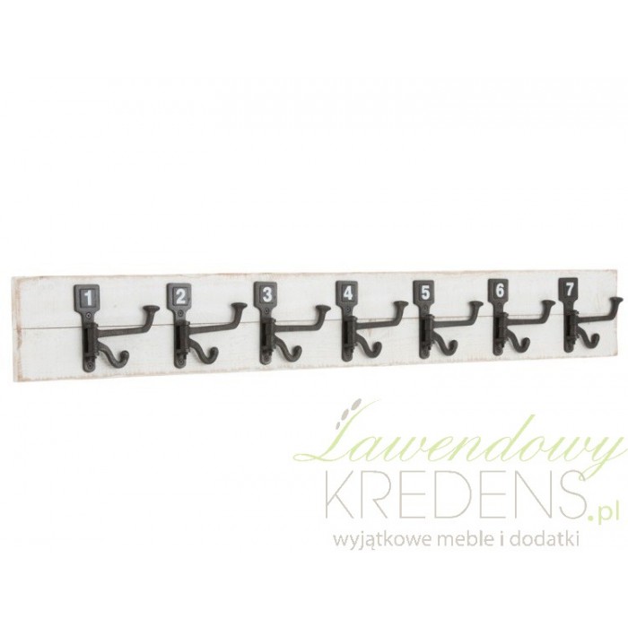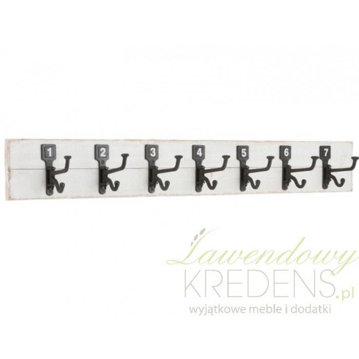 Długi wieszak ścienny z drewnianych desek z metalowymi haczykami pomalowany na biały kolor.