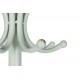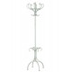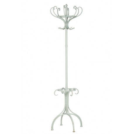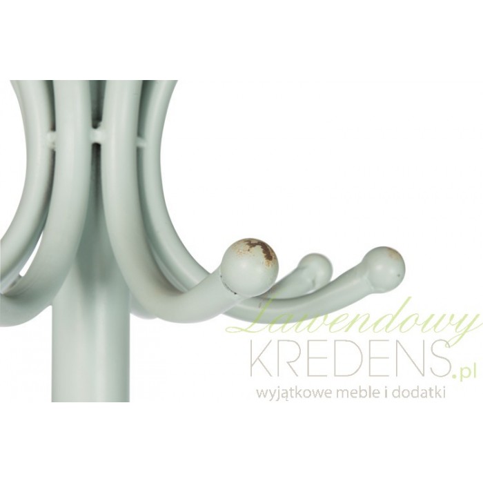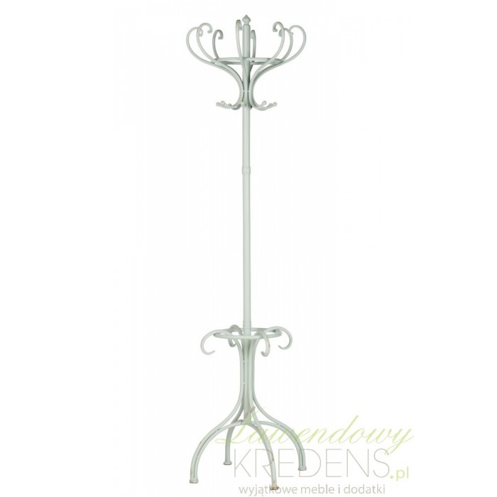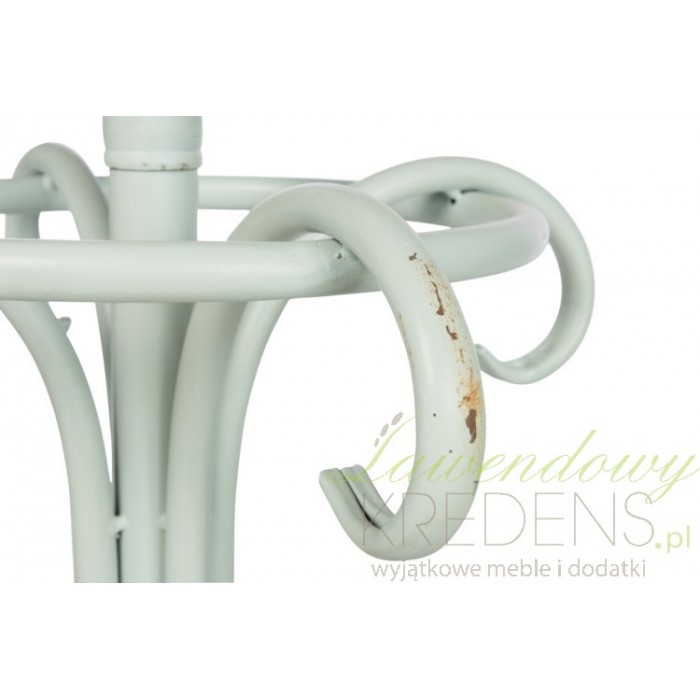 Klasyczny, jasnoszary wieszak podłogowy w stylu prowansalskim zrobiony z metalu ma wysokość bliską 190 centymetrów.