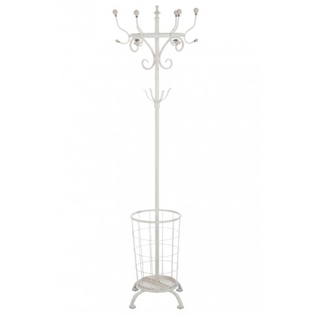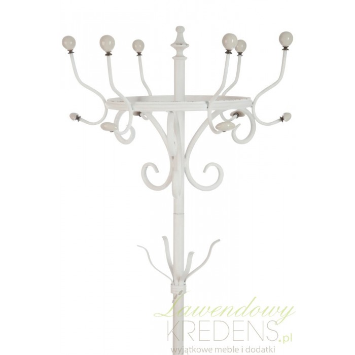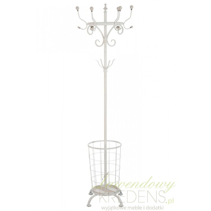 Wieszak prowansalski jest w kolorze jasnego kremu i ma przecierane brzegi. W górnej części wieszaka znajdują się gałki na których można zawiesić odzież wierzchnią a w dolnej części kosz na parasole lub inne dodatki. Wieszak stojący idelanie nada się w korytarzu zaraz przy drzwiach wejściowych by móc odrazu pozostawić na nim swoje okrycia. Wieszak podłogowy to element, który przyda się nie tylko w domu ale również w hotelu, sklepie czy w salonach usługowych.
