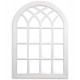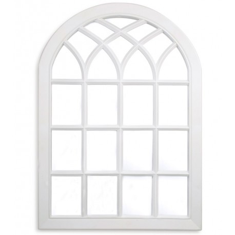 Białe lustro okno ma tarczę z ozdobnymi szprosami, które na górze tworzą dekoracyjny wzór na miarę francuskiego designu.