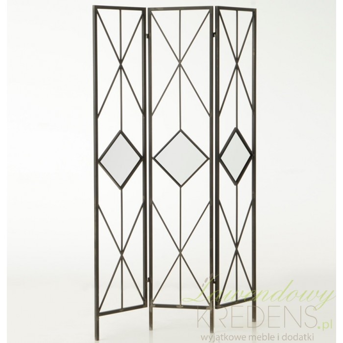 Metalowy parawan składa się z trzech ścianek, które swoją urodą doskonale wpiszą się w klimat wnętrz zarówno francuskich jak i industrialnych. Ten mebel to sposób by ozdobić salon, ale też oddzielić część jadalnianą od salonu. Parawan ma ciemny kolor i po środku każdej z trzech ścianek wbudowane lustro w kształcie rombu. Parawan od francuskiego producenta to gwarancja jakości i kapitalnego efektu końcowego każdej aranżacji.