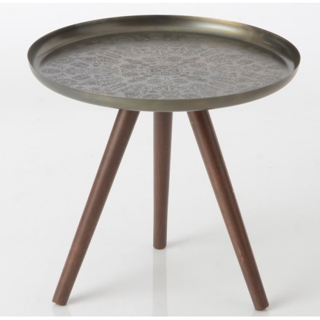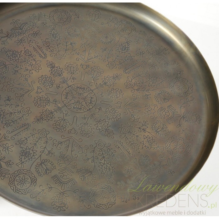 Stolik kawowy z metalowym blatem w formie tacy, na którym znajduje się mozaika etno z liści i kwiatów.