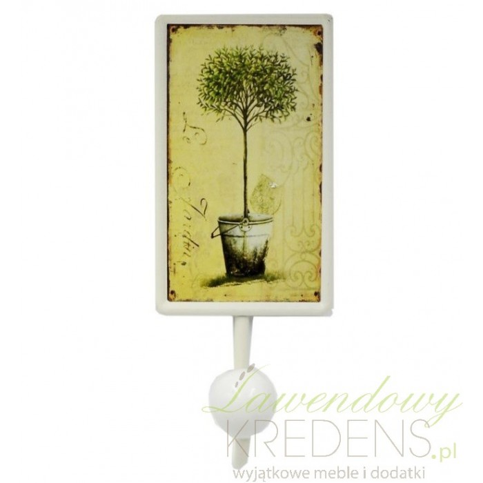 Wieszak prowansalski z tabliczką, która wygląda jak malowany przez cenionego artystę obraz przedstawiający ozdobne drzewko.