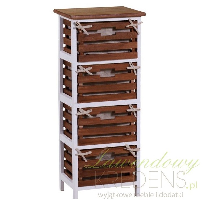 Szafka prowansalska o czterech ciemnobrązowych koszach i o blacie w kolorze koszy. Sama rama szafki ma kolor biały. Dodatowo, aby łatwiej było Ci utrzymać czystość, każdy z czterech koszy posiada bawełniany materiał, który łatwo wyjąć i wytrzepać lub uprać. Szafka jest bardzo praktyczna, może być na przyklad szafką na kosmetyki, przyprawy czy zabawki.