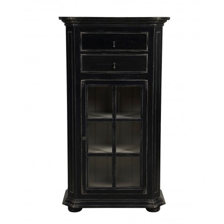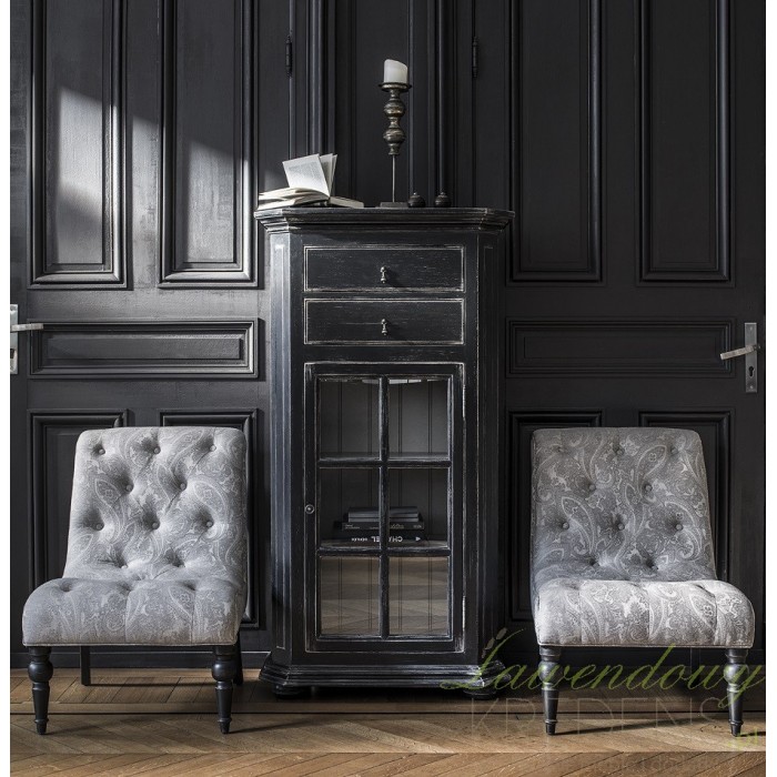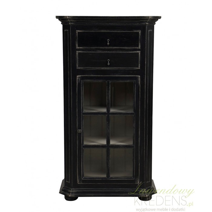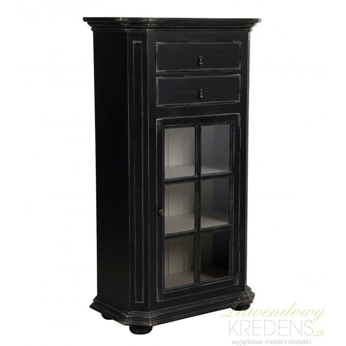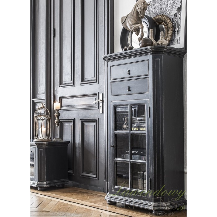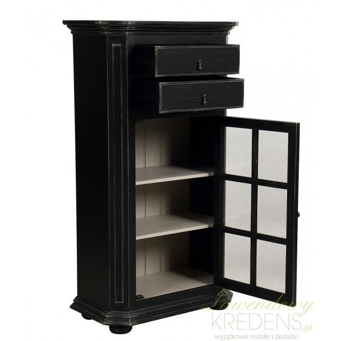 Szafka Bruges ma czarny kolor i przeszklone, pojedyncze drzwi w formie okiennicy. Za szklanymi drzwiami znajdują się dwie praktyczne półki, a tuż nad nimi dwie niskie szufladki z metalową, małą gałką. Meble Bruges są stylizowane na stare, dlatego spodobają się miłośnikom antyków i stylu prowansalskiego. Bez problemu dopasujesz do niej pozostałe meble Interior's - szukaj ich w naszym sklepie!