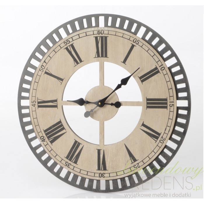 Okrągły zegar ścienny z ażurową obwolutą wskazującą na jego unikalne pochodzenie niczym z dawnej fabryki. Ten model ma czarne cyfry i czarne wskazówki widoczne na tle brązowej tarczy. Najlepszy efekt uzyskasz łącząc go z jasną ścianą. Postaw na oryginalne zegary ścienne w stylu industrialnym urządzając współczesne wnętrze.