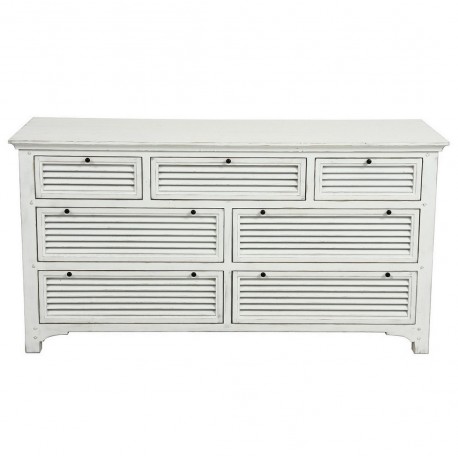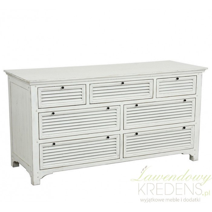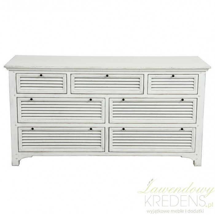 Szeroka komoda Venitiennes z siedmioma szufladkami posiadającymi fronty wykonane w formie drewnianych żaluzji.