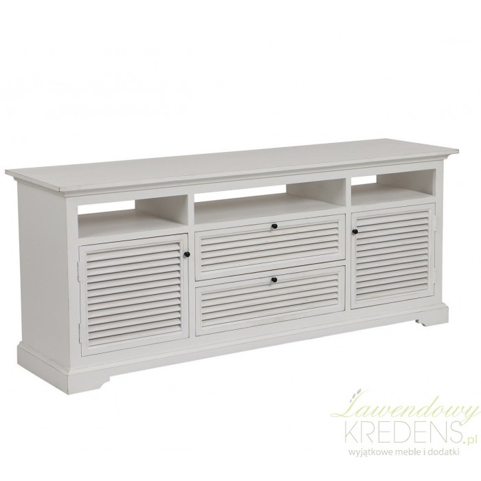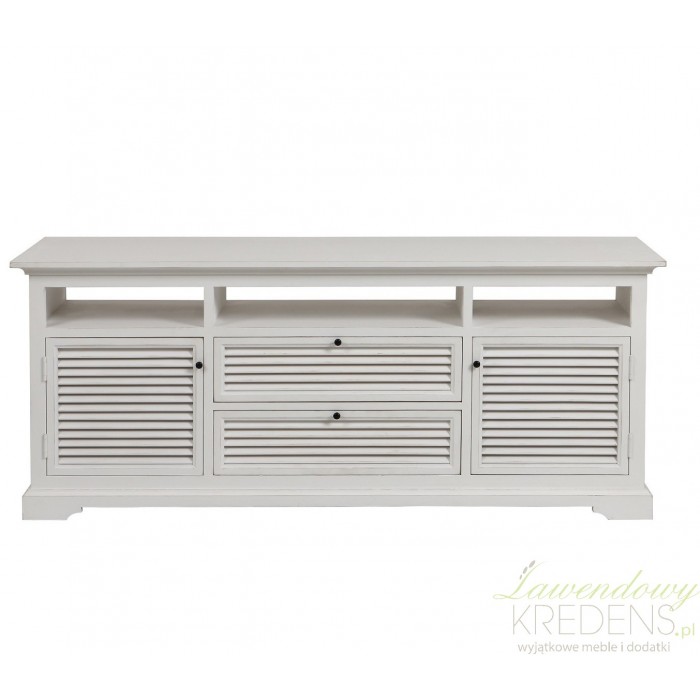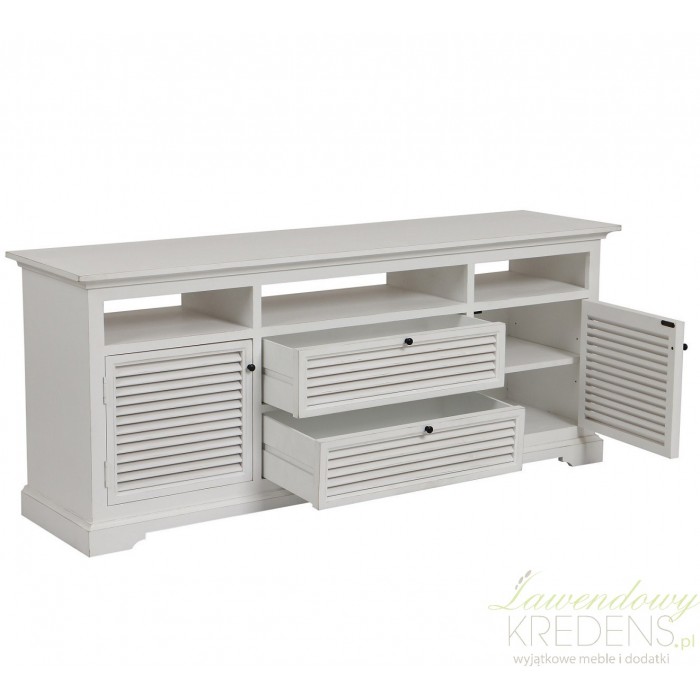Meble z kolekcji Venitiennes cechują się praktyczną formą i unikalną elegancją. Tradycyjny styl, szuflady i szafki wykonane w formie żaluzji, to wyznacznik stylu jakim niezaprzeczalnie wyróżnia się szafka RTV. Prezentowana szafka pod telewizor wykonana jest z drewna jodłowego i mdf. Posiada dwie szafki i dwie szufladki oraz półki na sprzęt elektroniczny.