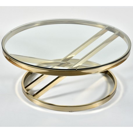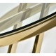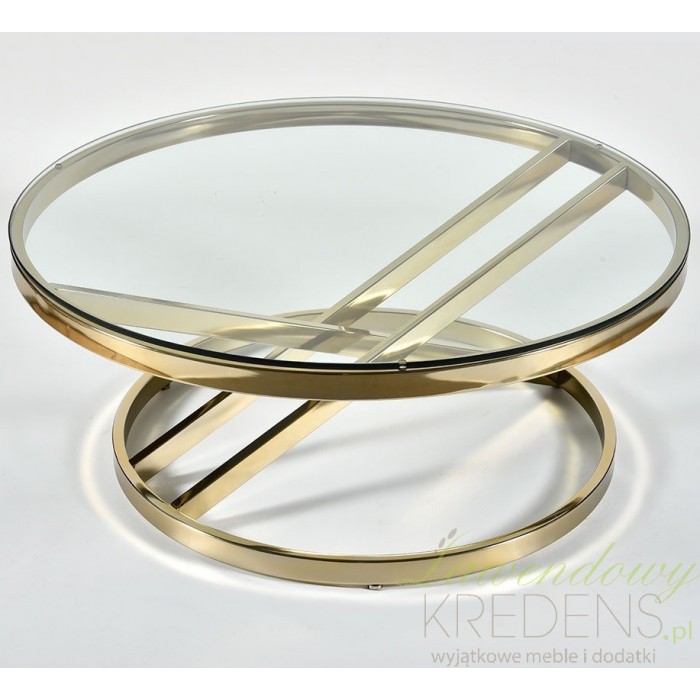 Stolik kawowy Beldleco z serii Deluxe Gold ma szklany blat w kształcie koła i metalowy stelaż w kolorze złota z efektownym połyskiem.