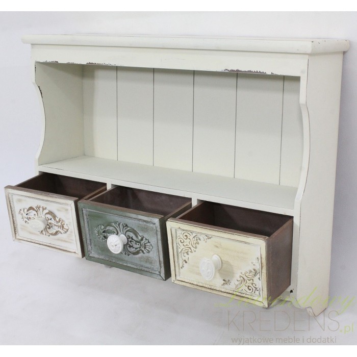 Szafki ścienne w stylu prowansalskim o kremowym kolorze z przetarciami farby. Trzy szufladki szafki mają pięknie zdoiony fronty ceramicznymi uchwytami - każdy biały lecz w innym kolorze. Oprócz szufladek szafka posiada trzy wieszaki, które - jeśli szafka zostanie powieszona w kuchni - będą idealne do zawieszenia rękawicy kuchennej, fartuszka kuchennego lub ściereczki.
