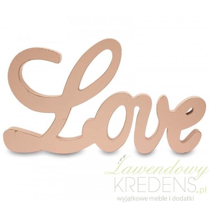 Stojący napis Love pomalowany został różową farbą, a krawędzie każdej z liter subtelnie przetarte. Ustawiony na półce lub na komodzie będzie przypominał każdego dnia o najważniejszych wartosciach w Twojej rodzinie. Doskonały również jako ozdoba stołu na weselnym lub urodzinowym przyjęciu. Postaw na dodatki w stylu prowansalskim i zapomnij o nudzie!