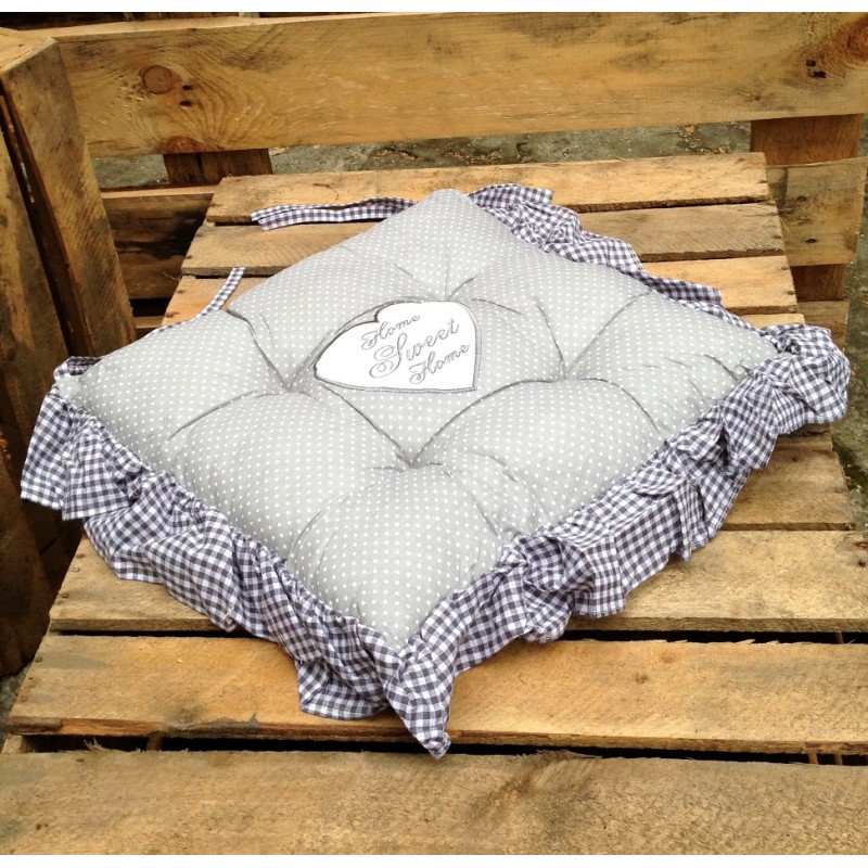 Przepiękne poduszki na krzesła z falbankami. Same poduszki mają szary kolor w białe groszki, a na ich środku znajduje się białe serduszko z szarym napisem Home Sweet Home. Poduszki na krzesło mają urocze falbanki, dzięki czemu pasują zarówno do większych krzeseł, na których siedziskach falbanki będą leżeć, jak i do mniejszych krzeseł z których falbanki będą swobodnie zwisać. Spód poduszek jest beżowy.