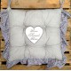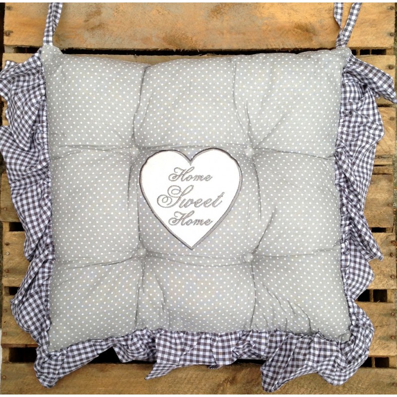 Poduszki na krzesła w groszki z ozdobnymi falbankami i napisem Home Sweet Home.