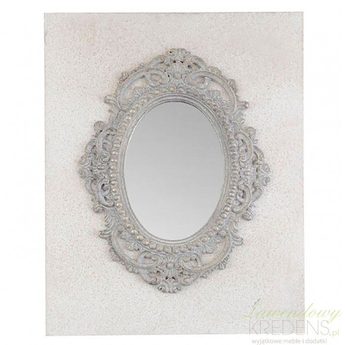 Prezentujące się niezwykle oryginalnie lustro prowansalskie w prostokątnej ramie z owalnym wycięciem na zwierciadło.