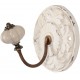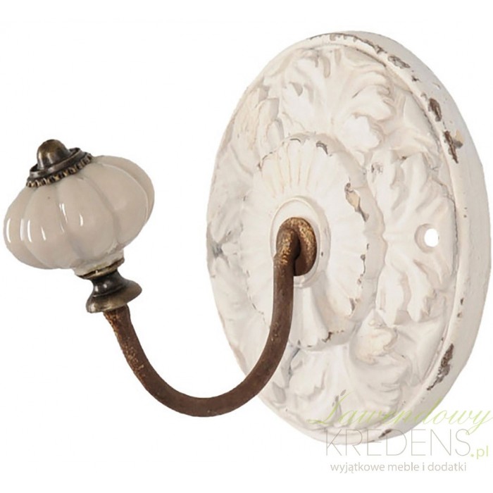 Kremowe wieszaki w stylu prowansalskim o ozdobnym, okrągłym kształcie. Okrągła część wieszaka wykonana jest z tworzywa, a sam wieszak zrobiony jest z metalu i na końcu posiada uroczą, ceramiczną gałeczkę także w kremowym kolorzze. Tym co wyróżnia wieszak od inych jest jego okrągła część bezpośrednio stykająca się ze ścianą - posiada ona śliczne rzeźbienia.