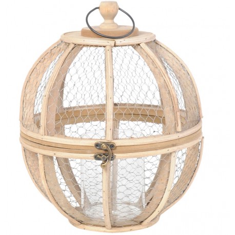 Ażurowy lampion z drewna i metalowej siatki z szklanym naczyniem na świecę w środku.