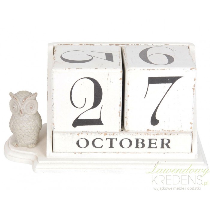 Ciekawy kalendarz z klockami stylizowany na styl prowansalski poprzez przetarcia farny na białej powierzchni drewna. Aby ustawić na klendarzu wystarczy wybrać na klockach odpowiedni dzień oraz miesiąc, które zapisane są czarnumi cyframi i literami. Dodatkową dekoracją kalendarza jest ciemniejsza figurka sowy umieszczona po lewej stronie. Kalendarz z klockami to świetny pomysł na dekorację Twojego biurka!