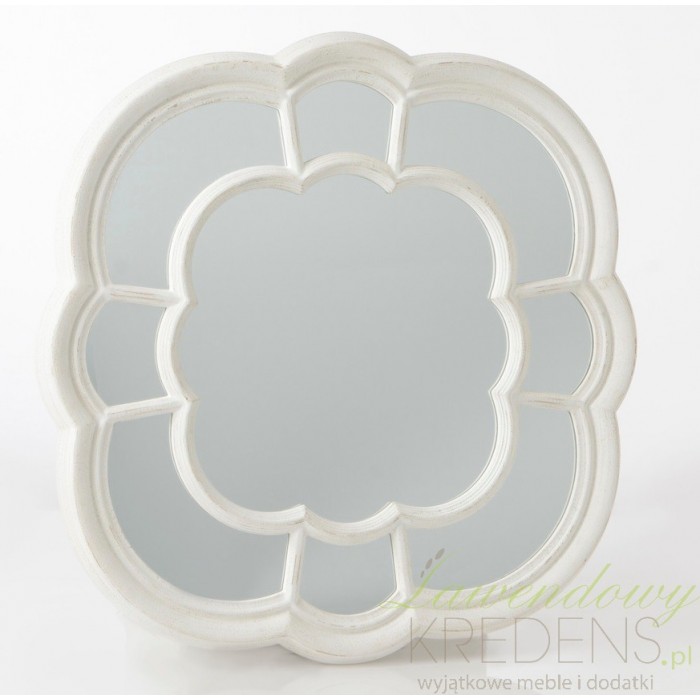 Lustro prowansalskie dzięki efektownej ramie przypomina kształtem kwiat z zaokrąglonymi płatkami.