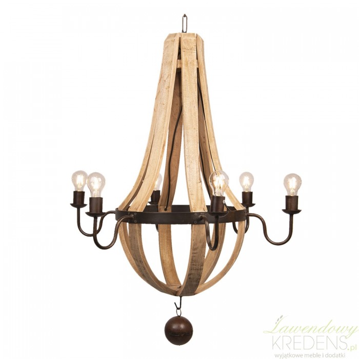 Nowoczesny żyrandol w stylu loftowym zachwyca swoim oryginalnym designem. Żyrandol jest sporych rozmiarów i składa się z drewnianych desek tworzących jego kształt oraz metalowych prętów z żarówkami. Całość dopełnia kulka zwisająca z żyrandola. Stylowy drewniany żyrandol świetnie nada się do salonu, sypialni czy dużych przestrzeni. Żyrandole loft to hit ostatnich sezonów!