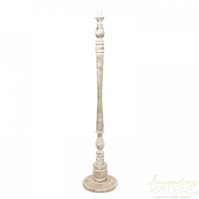 Wysoka i smukła lampa podłogowa w stylu prowansalskim posiada liczne, kuliste rzeźbienia i postarzające bielenia.