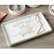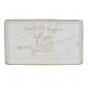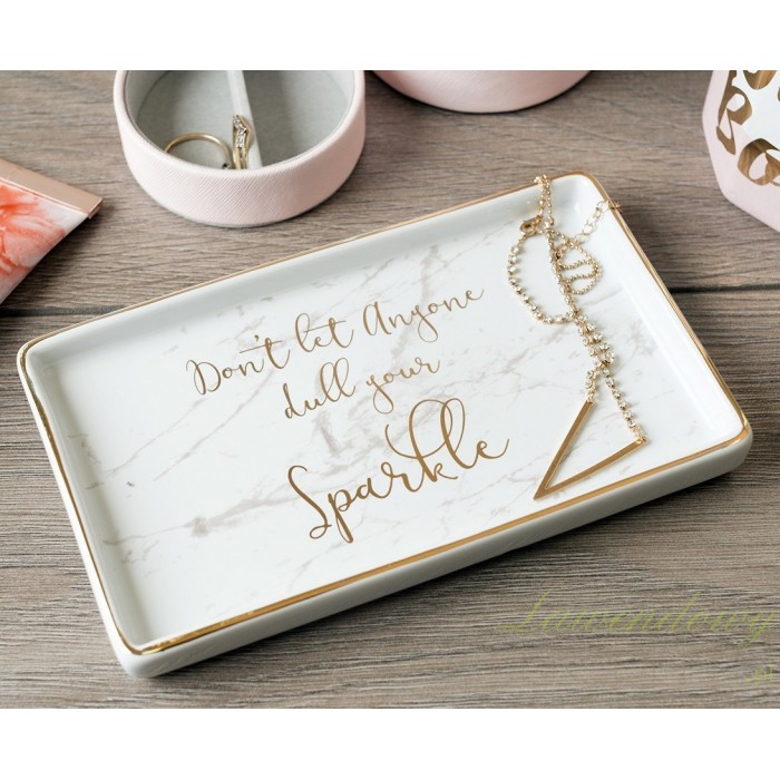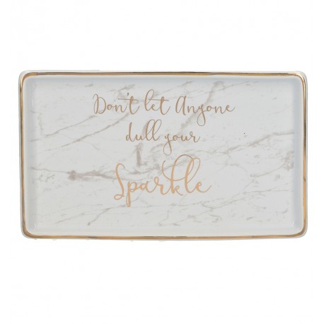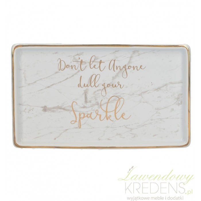 Tacka ozdobna z naszej oferty to hit ostatnich sezonów. Tacka jest wykonana z ceramiki, posiada marmurowy wzór oraz złoty napis w języku angielskim. Tacka jest prosokątna i będzie pięknym dodatkiem na toaletce, biurku czy komodzie. Dzięki niej możesz zebrać swoją kolekcję biżuterii lub gadżetów w jednym miejscu i w oryginalny sposób je zaprezentować!