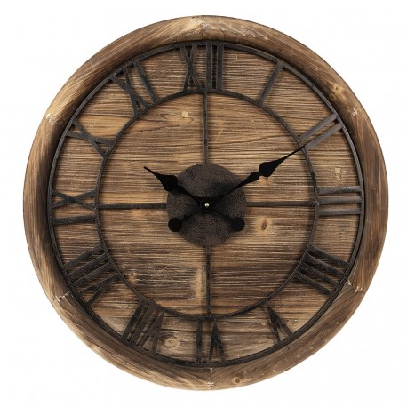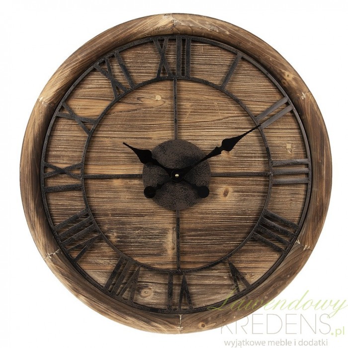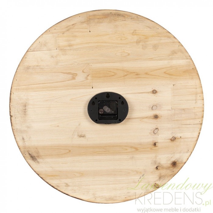 Zegar ścienny o średnicy 60 centymetrów ma drewniany cyferblat, którego integralną częścią jest metalowa nakładka z godzinami. Zegar wygląda jak celowo wypalony i wyszlifowany i ma widoczne usłojenie, które zdecydowanie podkreśla jego naturalność. Przygotuj się na flirt z naturalnymi dodatkami, wybierając do swojego wnętrza zegary ścienne od Clayre&Eef. To dzięki nim twoje wnętrze wypełni klimatyczna i harmonijna atmosfera.
