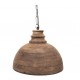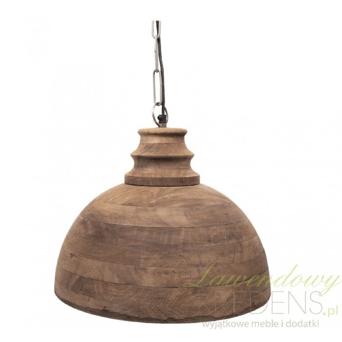 Drewniana lampa sufitowa to duży klosz w kolorze brązowym zawieszony na długim, białym łańcuchu.