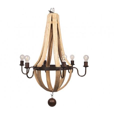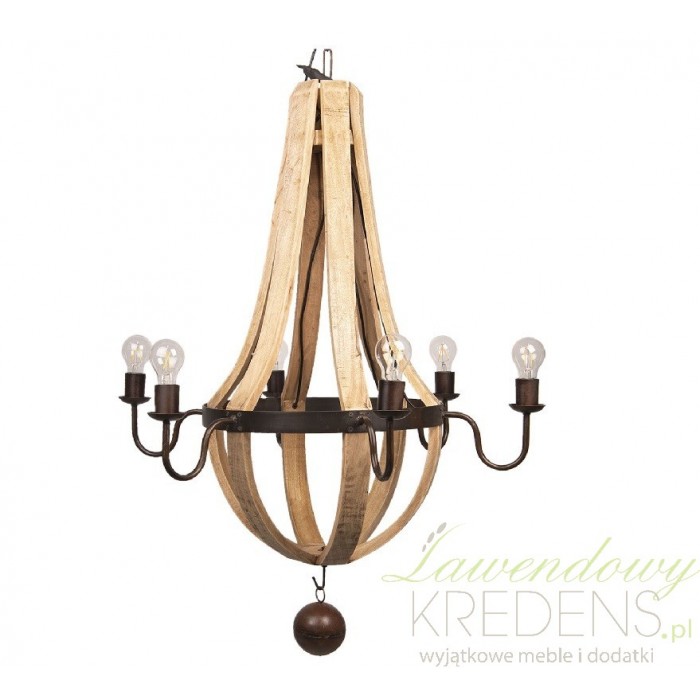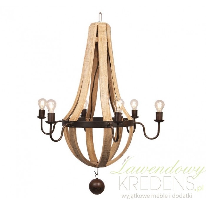 Drewniana lampa z sześcioma źródłami światła to oryginalny model oświetlenia do wnętrz prowansalskich i industrialnych.