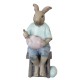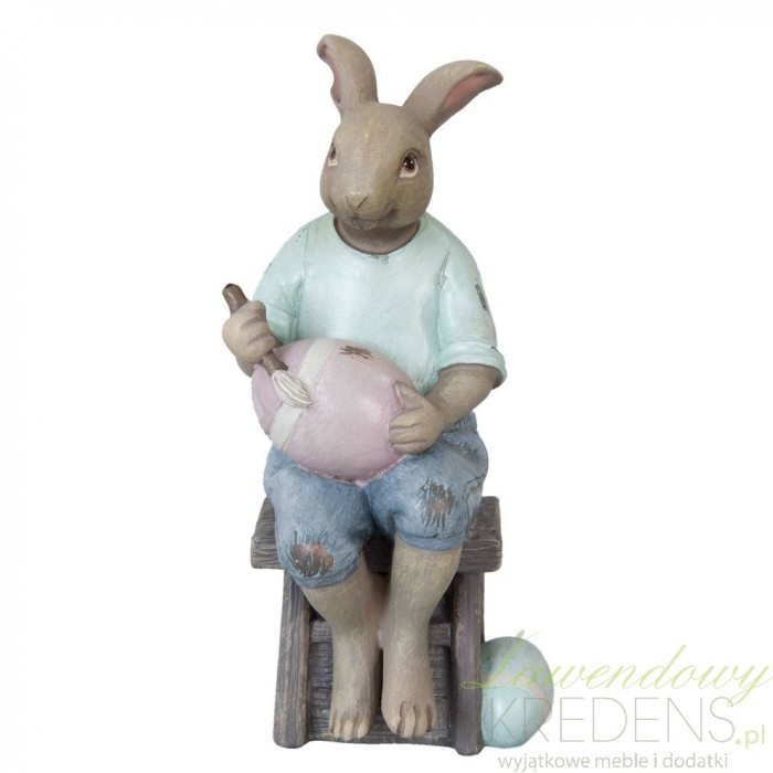 Figurka zająca wykonana z tworzywa przedstawia szaraka siedzącego na drewnianym stołku. Zając trzyma w ręce różowe jajo i maluje na nim pędzlem biały pasek. Kolorowy zając ozdobny to element wystroju wielkanocnej aranżacji we wnętrzach o różnej stylistyce. Zamów dekoracje wielkanocne na najważniejsze święta w całym roku i niechaj Twoje wnętrze wygląda pięknie!