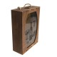 Brązowe pudełko na korki po winie to prostopadłościan wykonany z drewna, który jedną ścianę ma przeszkloną, a w drugiej ma wycięty otwór.