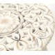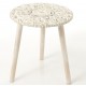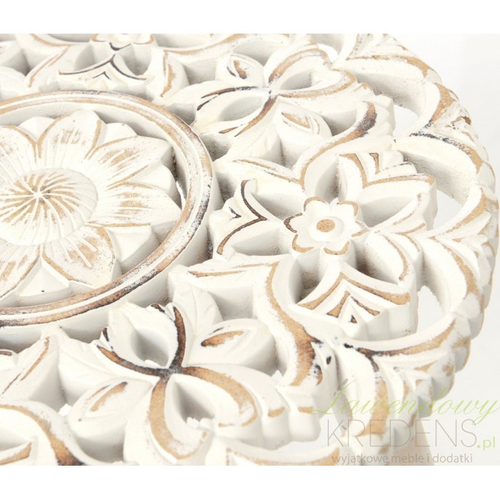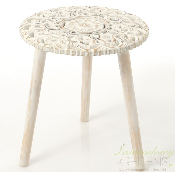Kawowy stolik prowansalski z rzeźbionym blatem stabilnie opiera się na trzech prostych nogach w kolorze bielonego brązu.