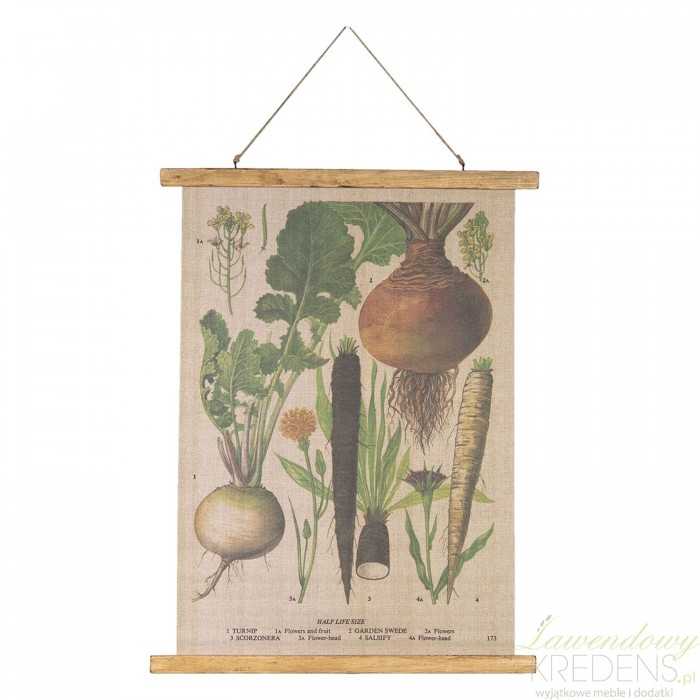 Obraz mapa został wykonany przy wykorzystaniu wyblakniętej tkaniny i dwóch desek drewnianych. Obraz zawiesisz za pomocą jasnego sznurka i gwoździa, który wbijesz w ścianę. Obraz retro przedstawia kolorowe warzywa z jesiennego ogrodu, w całej okazałości. Dodatki w stylu retro to pewność, że Twój dom będzie wyglądał bardzo klimatycznie.