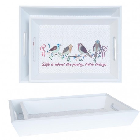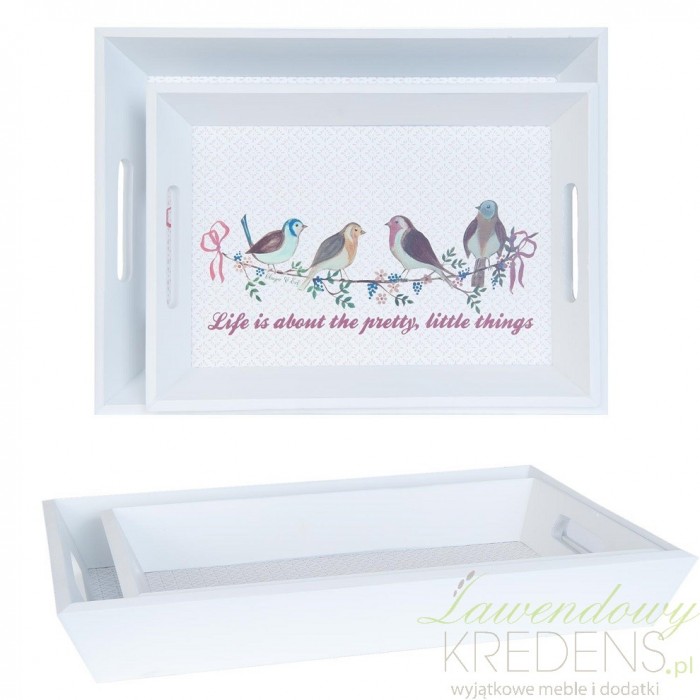 Biała taca prowansalska wykonana z drewna to uniwersalny dodatek, który powinien stanowić część wyposażenia każdej kuchni. Uwaga! Od nas dostaniesz aż dwie tace, które różnią się jedynie rozmiarem. Na spodzie każdej z nich znajduje się kolorowa grafika z ptaszkami oraz napisy. Tace w stylu prowansalskim do praktycznego wykorzystania pokochały tysiące naszych klientów!