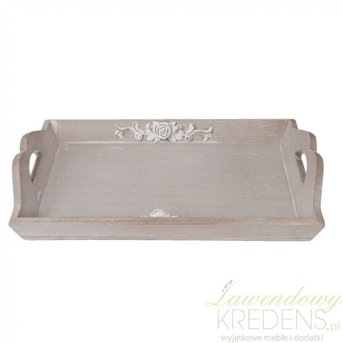 Oryginalna, prostokątna taca prowansalska wykonana z tworzywa i mdf. Zabudowana z czterech stron wysokimi na kilka centymetrów krawędziami. Opływowy kształt krawędzi to typowy, prowansalski design. Boki tacy dodatkowo zostały ozdobione wypukłymi aplikacjami wyglądającymi na rzeźbienia. Tace prowansalskie pięknie prezentują się jako dekoracja stołu, stolika i komody.