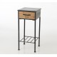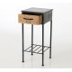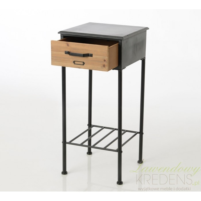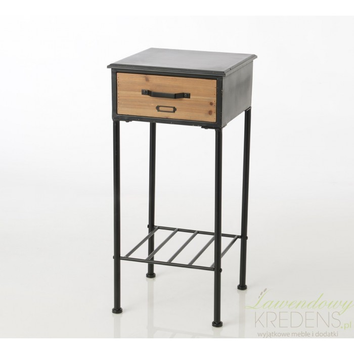 Wysoki i wąski stolik loftowy wykonany z metalowych i drewnianych komponentów posiada jedną, ale bardzo pojemną szufladkę.