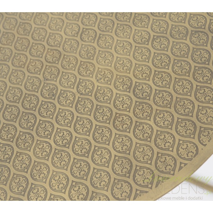 Okrągły stolik kawowy umieszczony na prostej konstrukcji w kształcie prostopadłościanu, ma dekoracyjny blat na którym widoczne są precyzyjnie wykonane, drobne wzorki.