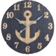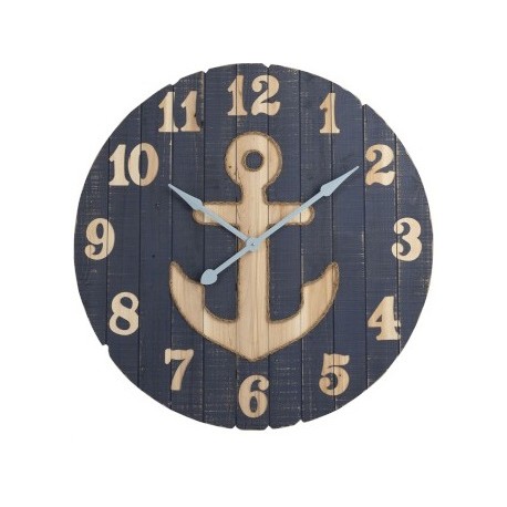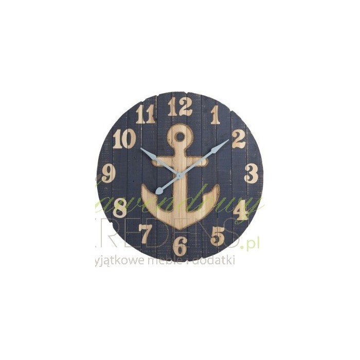 Zegar w stylu marynistycznym został zrobiony z drewna i prezentuje się bardzo oryginalnie. To wszystko za sprawą jasnych cyfr i kotwicy, które wyglądają jak wypalone w granatowej tarczy. Na cyferblacie znajdują się także dwie błękitne wskazówki, wyróżniające się na ciemnym tle. Zegary ścienne od marki Home Decorations to zdecydowanie jedne z najpiękniejszych modeli jakie mamy w naszej ofercie.