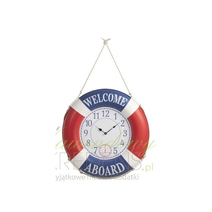 Zegar marynistyczny to zegar przypominający koło ratunkowe, w środku którego znajdują się wskazówki oraz cyfry odmierzające czas. Zegar wykonany został z tworzywa i głównymi jego kolorami jest czerwony, granatowy oraz biały. Zegar posiada również sznurek, dzięki któremu z łatwością powiesisz go na ścianę. Zegary w stylu marynistycznym takie jak zegary ścienne to dodatki, których nie może zabraknąć w Twoim wnętrzu!