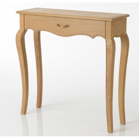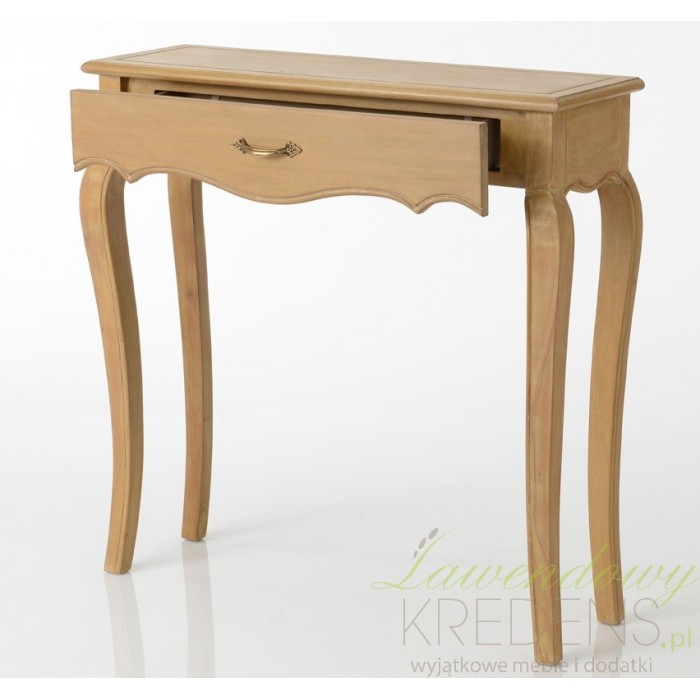 Stylowa konsola prowansalska z drewna o jasnym wybarwieniu wyposażona jest w pojemną szufladę z metalowym uchwytem. Zajmująca mało miejsca konstrukcja jest bardzo praktyczna, a w dodatku wyróżnia się ponadczasowym designem. Eklektycznie wyglądające meble z kolekcji Memori doskonale pasują do różnego typu wnętrz. Ciesz się szeroką gamą rozmiarów drewnianych konsoli, znajdziesz je w naszej ofercie!