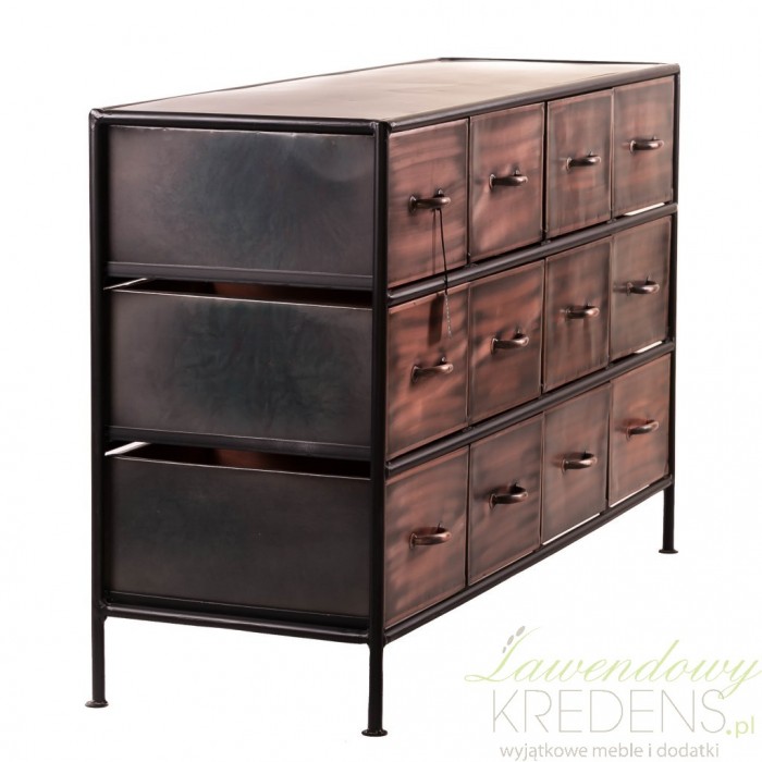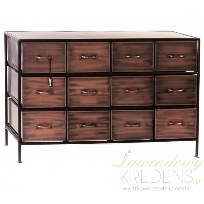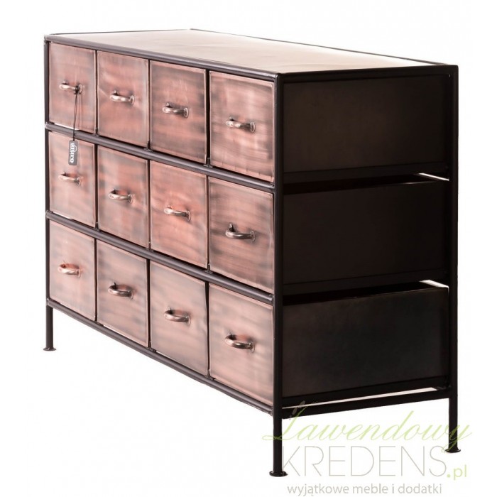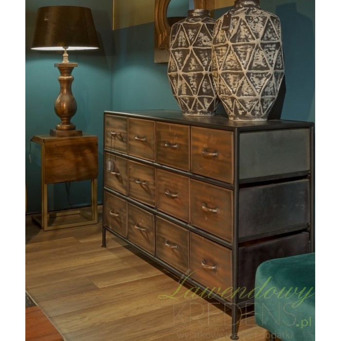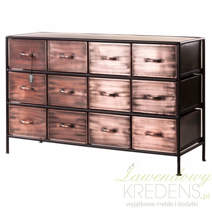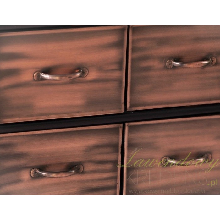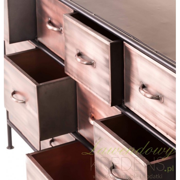 Duża, zdecydowana i pełna stylu komoda Aluro, genialnie zaadoptuje każde wnętrze w szykowny i elegancki loft. Przemyślany kształt mebla i czarno-mosiężny kolor to pewność, że pozbawisz swoje wnętrze rutyny - raz na zawsze! Seria Demon polecana jest szczególnie do wnętrz takich jak salony, industrialne sypialnie i pokoje hotelowe. Wnętrza pozbawione słodkich dodatków i gryzących się ze sobą kolorów, mocno kipiące surowością i prostotą - to miejsce perfekcyjne dla komody Aluro z dwunastoma szufladami!