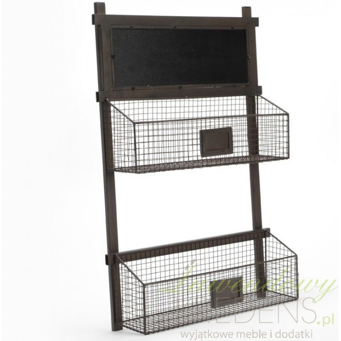 Metalowe kosze ścienne zastąpią tradycyjne półki w kuchni, w łazience lub w przedpokoju, oferując miejsce na klucze, listy, przyprawy lub kosmetyki. Dwa druciane kosze zamocowano do drewnianej ramy, w którą wmontowano też tablicę do pisania kredą. Dodatkowo, każdy z koszy posiada małą tabliczkę, w której można zostawić kartkę z własnym oznaczeniem jego zawartości. Chcesz wprowadzić styl industrialny do swojego domu? Zamów metalowe meble w stylu industrialnym oraz industrialne dodatki!