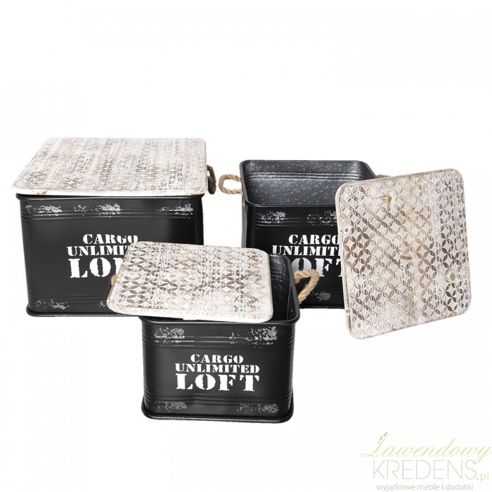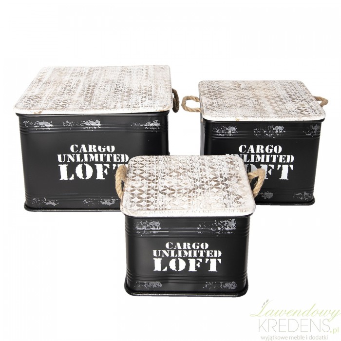 Stoliki kawowe z blatami z drewna, które zostały ozdobione wzorem w romby i mocno przetarte. To również funkcjonalny schowek do wnętrz loft i industrialnych. Czarne, metalowe pojemniki w trzech różnych rozmiarach mają kształt prostokątów, a ich funkcjonalność dodatkowo wzmacniają uchwyty ze sznura. Każdy z pojemników zdobi biały napis "cargo unlimited loft". Styl industrialny to design, który pokochasz!