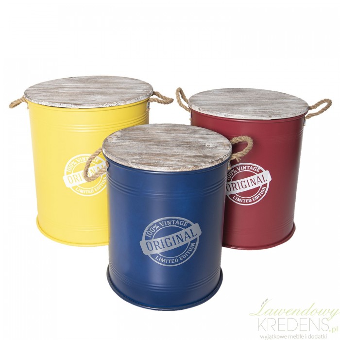 Metalowe pojemniki z drewnianym blatem, o iście wszechstronnym zastosowaniu. Kolorowe pojemniki wyposażone w uchwyty ze sznura i bielone blaty sprawdzą się równie dobrze jako stoliki kawowe w loftowym barze lub kuchni. Bez znaczenia czym je wypełnisz, bo doskonale sprawdzą się w każdej roli. Każdy z pojemników zdobi grafika przypominająca pieczęć z jasnym napisem: "original".
