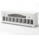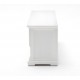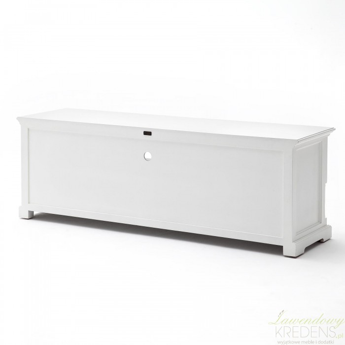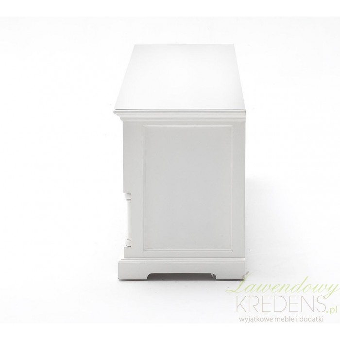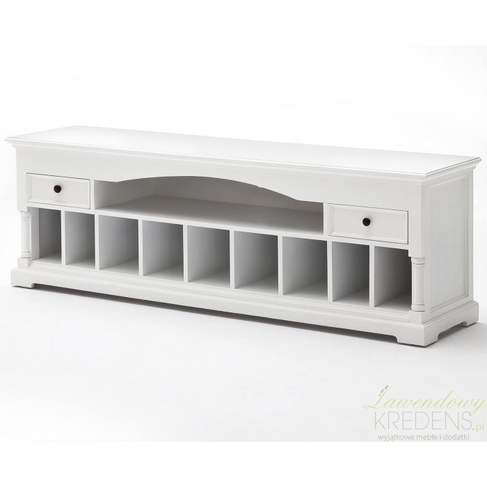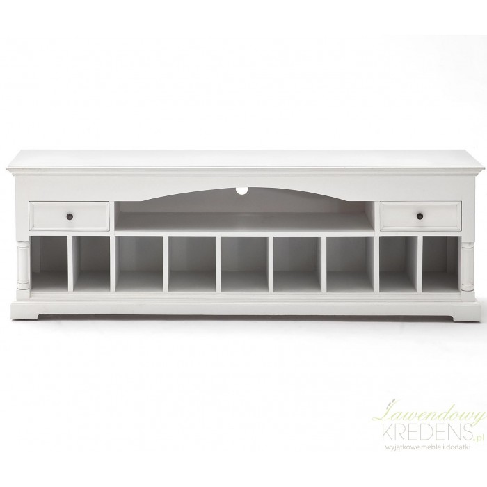 Stylowa, elegancka komoda prowansalska pod sprzęt RTV do salonu lub do modnej sypialni. Szafka posiada kilka przegródek będących idealnym miejscem na płyty CD lub DVD. Na środku znajduje się duża wnęka, po bokach której wstawiono dwie mniejsze szufladki. Komoda prowansalska podobnie jak inne meble z serii Lumi ma biały kolor, dzięki czemu wydaje się lekka i delikatna.