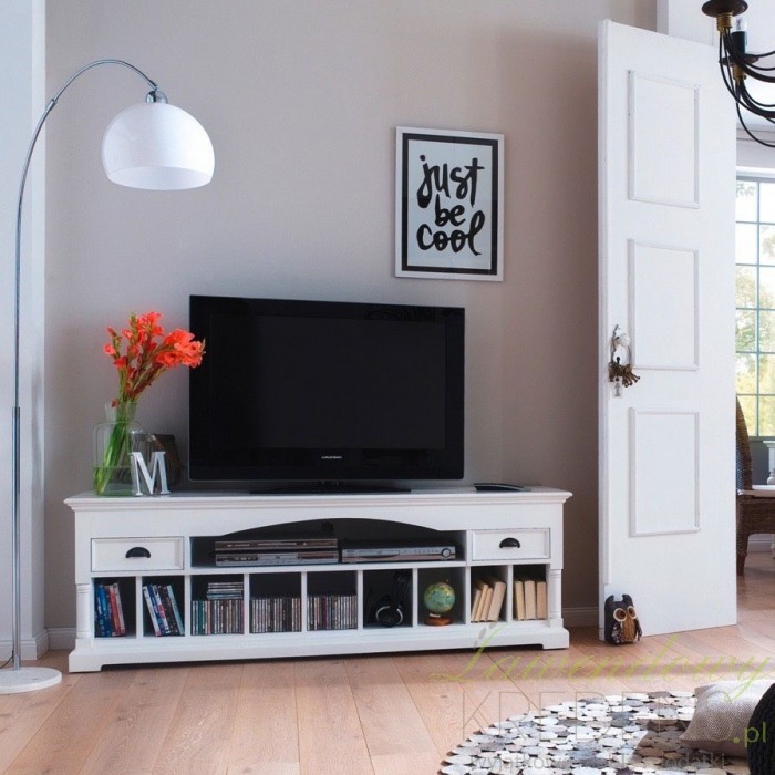 Duża komoda w stylu prowansalskim to idealny mebel, na którym zmieści się nawet największy telewizor.