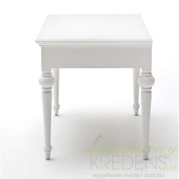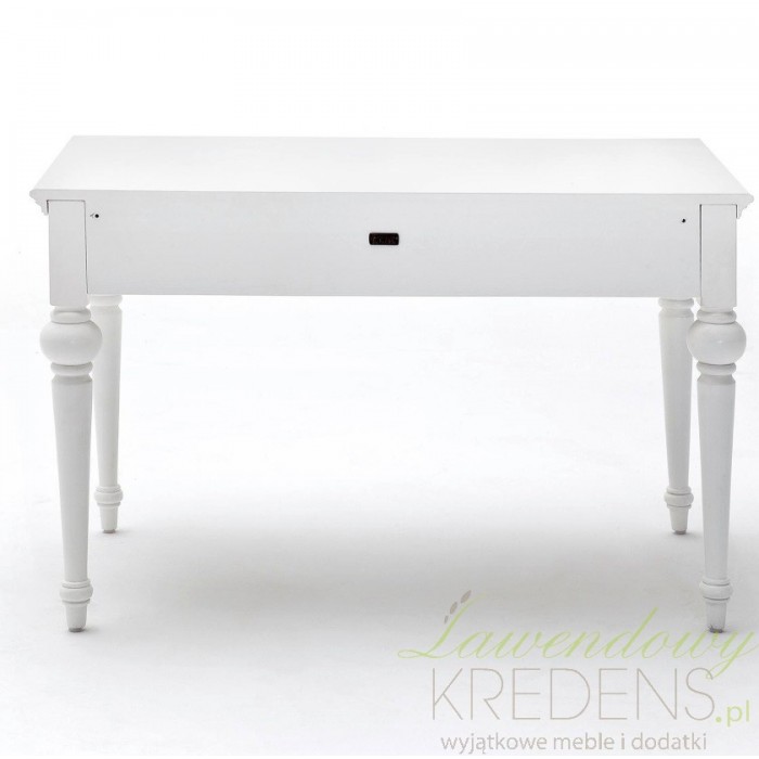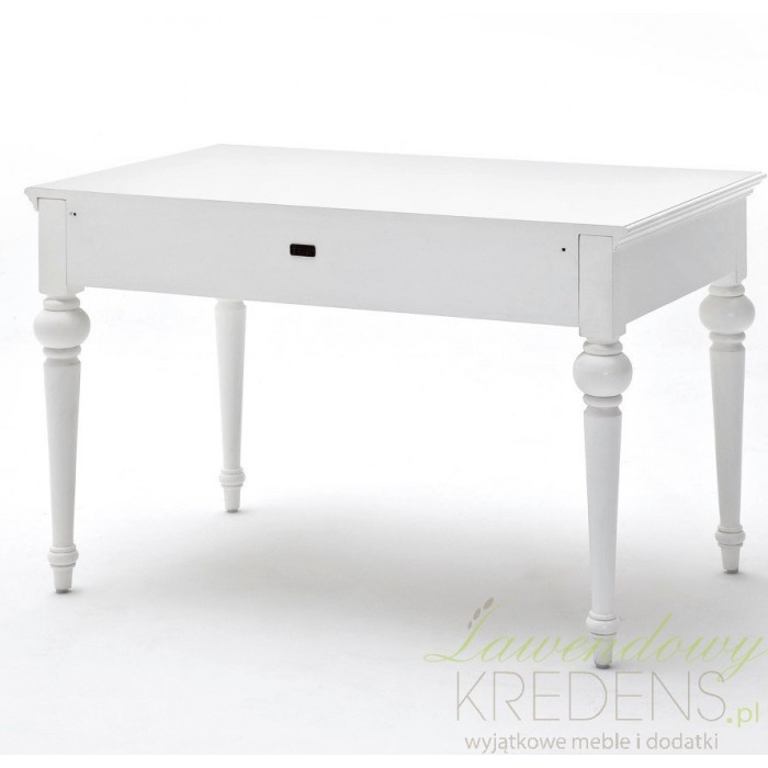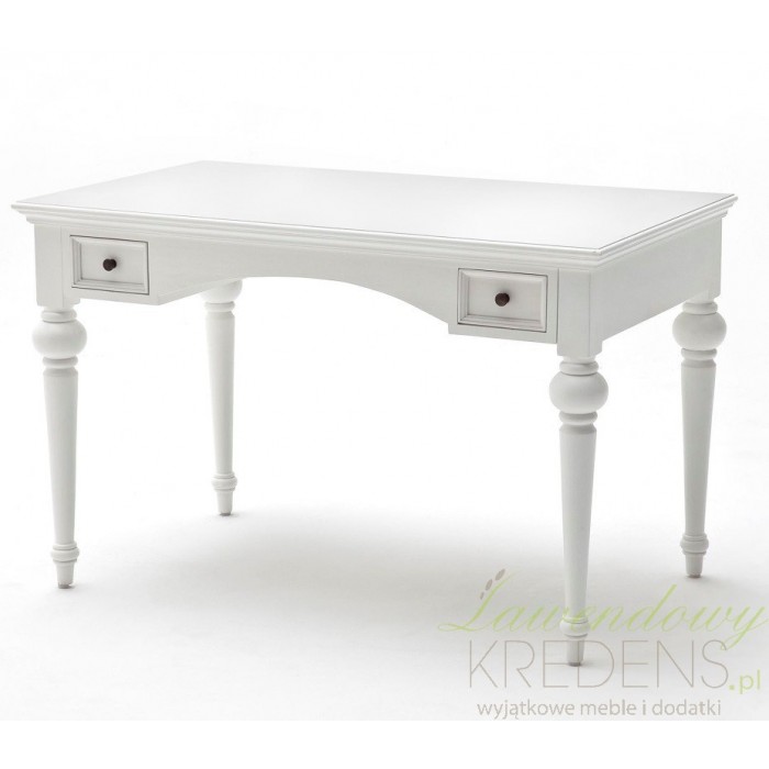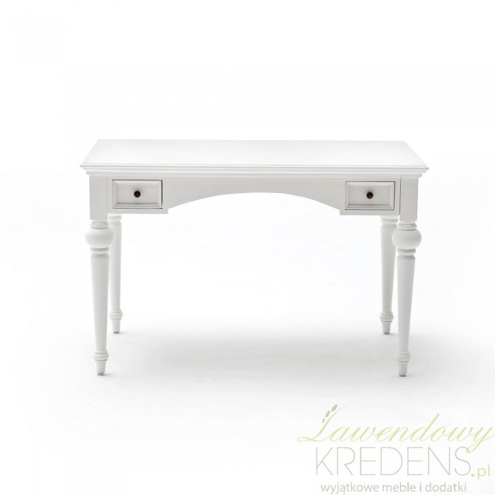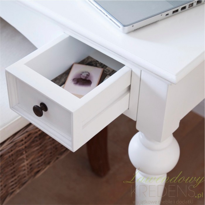 Stylowe biurko prowansalskie jest ustawione na czterech nogach z kulistymi rzeźbieniami tuż pod blatem. Malowane na biało i wyposażone w dwie szufladki może sprawdzić się w roli praktycznego i stylowego biurka do pracy lub po powieszeniu lustra - w roli prowansalskiej toaletki w sypialni. Biurko w stylu prowansalskim to mebel, który pomoże Ci zaaranżować romantyczne wnętrze. Meble prowansalskie z serii Lumi - i mieszkasz pięknie!